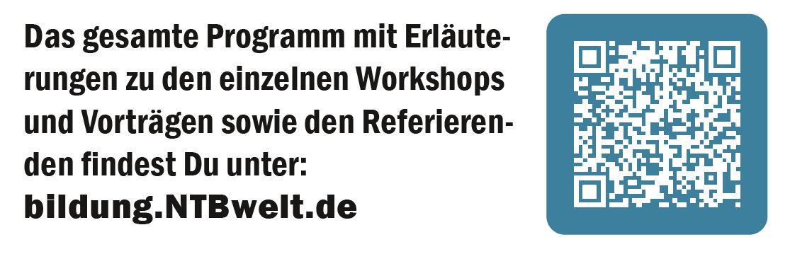 Aus der Vielzahl der Angebote können je nach Wunsch bis zu acht Veranstaltungen (fünf Praxisworkshops sowie drei besondere Formate) und der Hauptvortrag belegt werden. Wir als Veranstalter behalten uns vor, Workshops mangels Teilnahmeinteresse abzusagen. Sollte dies der Fall sein, werden die betroffenen Teilnehmenden zunächst auf die ausgewählte Zweitwahl umgebucht. Daher sind alle Teilnehmenden dazu aufgerufen, neben dem verbindlichen Erstwunsch einen Zweitwunsch anzugeben! Der endgültige persönliche Workshopplan wird mit den Teilnahmeunterlagen ausgegeben.