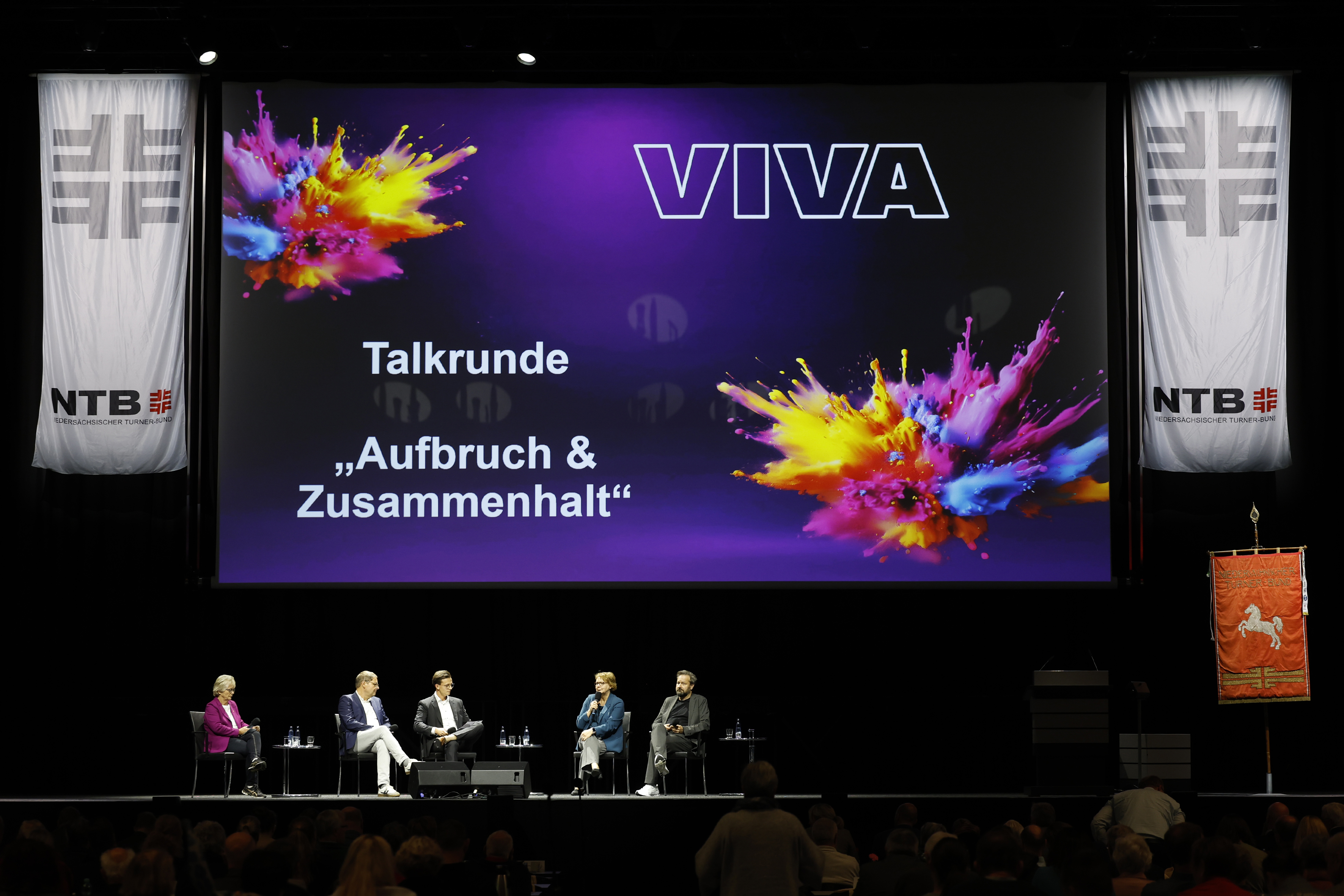 Beim 39. Landesturntag des Niedersächsischen Turner-Bundes (NTB) am 08. November in der Volkswagen Halle Braunschweig begrüßte NTB-Präsident Heiner Bartling zahlreiche hochrangige Gäste aus Sport, Politik und Wirtschaft. Darunter Marcus Bosse, Vizepräsident des Nds. Landtages, Daniela Behrens, Nds. Ministerin für Inneres, Sport und Digitalisierung, Annegret Ihbe, Bürgermeisterin der Stadt Braunschweig, Gerhard Glogowski, Nds. Ministerpräsident a.D. und André Kwiatkowski, Präsident des LandesSportBundes Niedersachsen. In einer unterhaltsamen Talkrunde tauschten sie sich zum Leitthema des Landesturntages „VIVA – Lebensfreude, Aufbruch und Zusammenhalt“ aus.