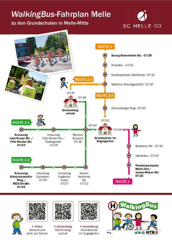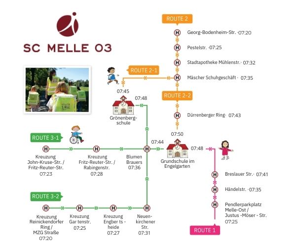 Nachdem zunächst mit einer Route gestartet wurde, konnte durch die gemeinsame Arbeit der drei Kooperationspartner (Grönenbergschule, Grundschule im Engelgarten und SC Melle 03) nach und nach dieses großartige Netz an WalkingBus-Routen entstehen.