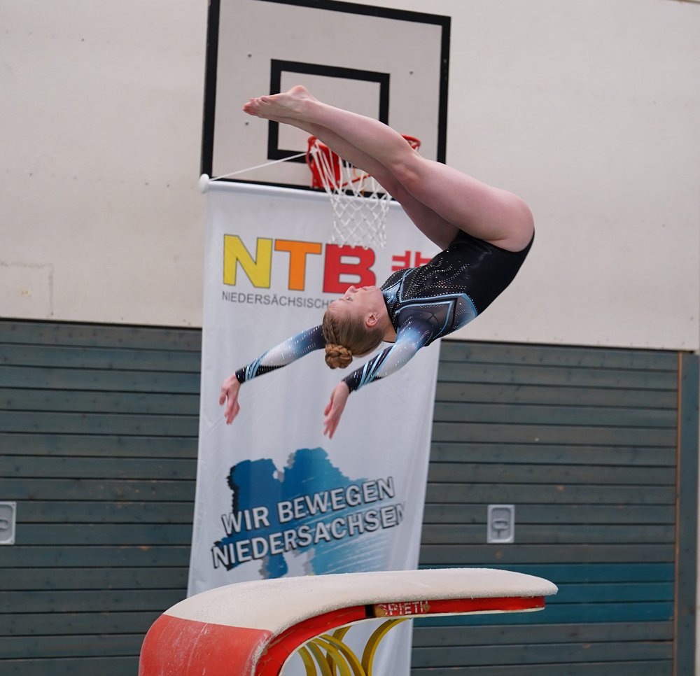 Nachmittags gingen die LK1-Turnerinnen an die Geräte. Bei den 16-29-Jährigen holte sich von 20 Starterinnen Yola Stehle den Titel. Mit 13er-Wertungen am Sprung, Schwebebalken und Boden sowie einer soliden Stufenbarren-Übung war sie nicht zu schlagen. Die Plätze 2 und 3 belegten Anna Neumann und Berit Borck, die sich ein enges Kopf-an-Kopf-Rennen lieferten und beide einen überzeugenden Wettkampf turnten. Die Plätze 4 bis 6 belegten und somit ebenfalls zum Bundespokal der Landesturnverbände qualifiziert sind Jasmin Grimm, Diana Dickhoff und Lotta Zirkel. In der Altersklasse der 12-15-Jährigen erturnte sich mit sicheren Übungen an allen Geräten die erst 13-jährige Sofie Stengel den Sieg, die erstmals einen LK-1-Wettkampf absolvierte und stolz die Goldmedaille entgegen nahm. Silber und Bronze ging an Zoe Krüger und Lea Rauch, die beide zwar nicht ganz fehlerfrei blieben, aber dennoch überzeugen konnten und das Siegertreppchen komplettierten. Der Mannschaft dieser Altersklasse werden außerdem Victoria Ellersiek, Charlotte Ansorge und Sophie Denninghaus angehören, die die Plätze 4 bis 6 erreichten.
