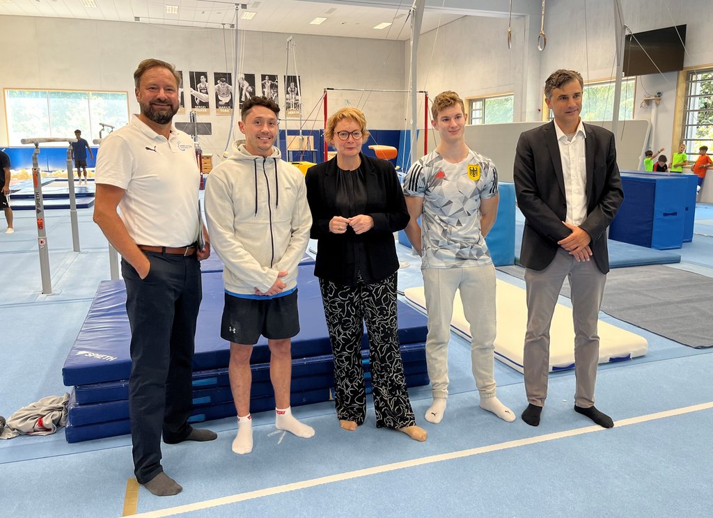 Im Rahmen ihrer Sommerreise besuchte die Niedersächsische Ministerin für Inneres und Sport, Daniela Behrens, am 15.08. den Olympiastützpunkt Hannover und führte dabei auch ein längeres Gespräch mit unseren beiden National-Turnern Andreas Toba und Glenn Triebing. Dieses Treffen wurde zusätzlich begleitet vom Präsidenten des Landessportbundes Niedersachsen, André Kwiatkowski, und dem Leiter des Olympiastützpunktes Niedersachsen, Dr. Boris Ullrich.