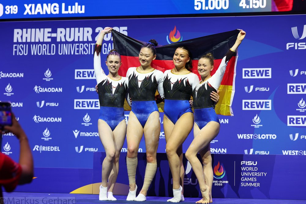 Bei den FISU World University Games Rhine-Ruhr 2025, einer internationale Multisportveranstaltung für Studierende, ging Alina Heinemann (23 Jahre) gemeinsam mit drei weiteren Turnerinnen für Deutschland an den Start. Die FISU (früher Universade) ist die größte Hochschulsportveranstaltung der Welt, die alle zwei Jahre ausgetragen wird. Bei der Eröffnungsfeier in Duisburg – angelehnt an die Olympischen Spiele – kamen ca. 8500 Sportlerinnen und Sportler aller teilnehmenden Sportarten zusammen. Alleine diese Veranstaltung war für Alina ein unvergessliches Erlebnis. Die Turnwettkämpfe fanden dann in Essen statt und Alina konnte eindrucksvoll unter Beweis stellen, weshalb sie für das Deutsche Team nominiert worden war. Ohne größere Fehler absolvierte sie ihre Übungen und kam mit 47,60 Punkten als beste Deutsche Vierkämpferin auf Platz 39 im internationalen Vergleich. In der Mannschaftswertung kamen die Deutschen Frauen auf Rang 15. An den FISU World University Games Rhine-Ruhr 2025 teilgenommen zu haben, war für alle Aktiven ein riesiges Erlebnis, 20 Jahre hatte es gedauert, diesen Wettkampf nach Deutschland zu holen.