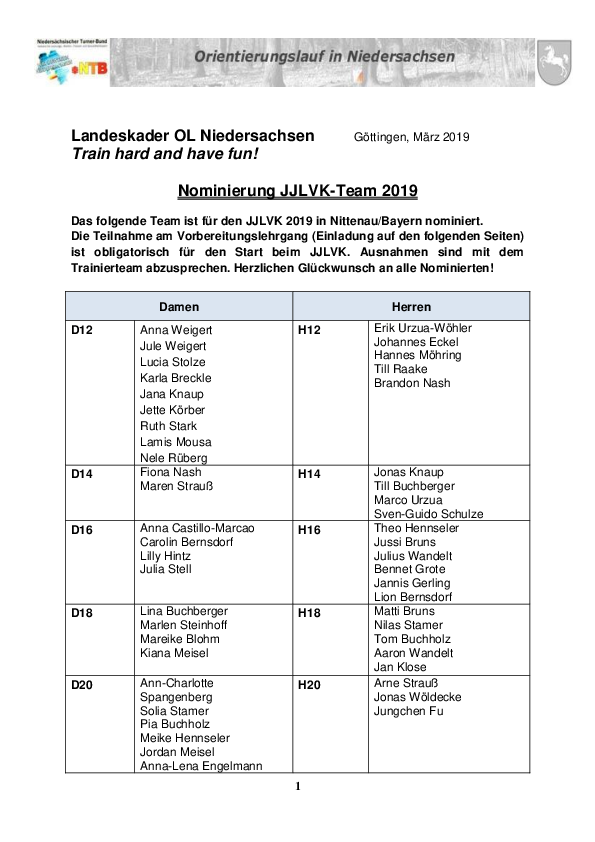 Zusatzinformation: Obligatorische Teilnahme für alle Nominierten für den Jugend- und Juniorenländervergleichskampf am 26. bis 28. April in Nittenau/Bayern.