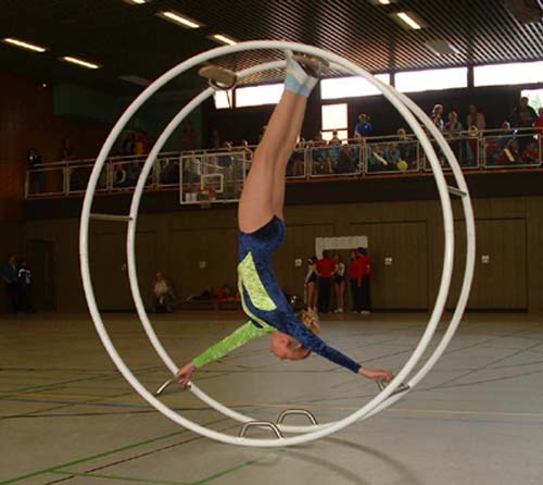 Beim Spiraleturnen bewegt sich das Rhönrad kreisförmig auf einem Reifen. Durch entsprechende Körperverlagerung hält der Turner das Rad auf der Kreisbahn und führt dabei verschiedene Übungen aus, die in einem Schwierigkeitskatalog in A-, B-, C- und D-Teile eingeteilt sind. Man unterscheidet zwischen der "Großen Spirale", bei der der Neigungswinkel des Rhönrades über 60° liegen muss, und der "Kleinen Spirale", bei der der Neigungswinkel des Rades unter 30° liegen muss. Beide Spiralearten sind in den Übungen vorgeschrieben. Die Fläche beim Spiraleturnen ist 13m x 13m (plus Sicherheitszone) groß.